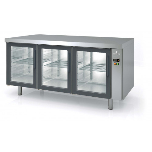 Meuble 800 positif - Série PÂTISSIER 600 X 400 sans groupe - Température -2°/+8°C - 3 portes vitrées (double vitrage + éclairage LED) - Capacité 595L - Livré sans groupe, sans capillaire ni détendeur - Bandeaux de commande démontables - Extérieur et intérieur en inox AISI-304 18/10 (sauf partie arrière en galva) - Froid ventilé (statique sur demande) et sans dosseret (dosseret sur demande) - Thermostat électronique avec afficheur digital, spécial économie d'énergie - Alarme haute et basse température sur contrôleur digital - Evaporateur ventilé traité anti-corrosion - Compresseur hermétique ventilé sur glissières - Pas d'évaporation ni de résistance pour les eaux de condensat - Porte emboutie et réversible - Charnière inox - Joint déclispable - Pieds inox réglables en hauteur de 125 à 200 mm - Livré avec 5 jeux de glissières inox par porte (sans clayette ou plaque) - Ambiance 32°C