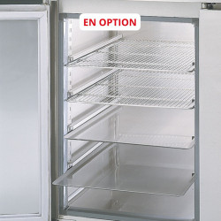 Meuble 800 positif - Série PÂTISSIER 600 X 400 sans groupe - Température -2°/+8°C - 4 portes vitrées (double vitrage + éclairage LED) - Capacité 815L - Livré sans groupe, sans capillaire ni détendeur - Bandeaux de commande démontables - Extérieur et intérieur en inox AISI-304 18/10 (sauf partie arrière en galva) - Froid ventilé (statique sur demande) et sans dosseret (dosseret sur demande) - Thermostat électronique avec afficheur digital, spécial économie d'énergie - Alarme haute et basse température sur contrôleur digital - Evaporateur ventilé traité anti-corrosion - Compresseur hermétique ventilé sur glissières - Pas d'évaporation ni de résistance pour les eaux de condensat - Porte emboutie et réversible - Charnière inox - Joint déclispable - Pieds inox réglables en hauteur de 125 à 200 mm - Livré avec 5 jeux de glissières inox par porte (sans clayette ou plaque) - Ambiance 32°C