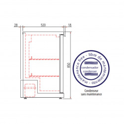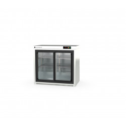 Arrière bar - Température +2°/+8°C - 2 portes vitrées coulissantes(double vitrage) - Stockage : 275 bouteilles (33cl) - Capacité : 200l - Extérieur inox - Intérieur en acier plastifié gris - Eclairage intérieur LED - Thermostat électronique avec afficheur digital, spécial économie d'énergie, protégé des projections - Evaporation automatique des eaux de dégivrage - Livré sur tampons réglables - Livré avec 2 clayettes rilsan réglables en hauteur - Compresseur : 1/5cv - Alarme haute et basse température sur contrôleur digital