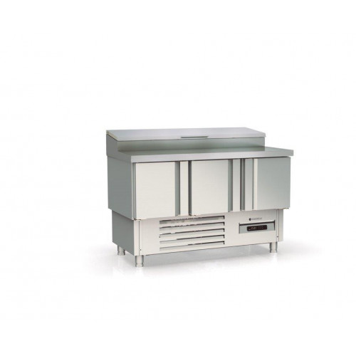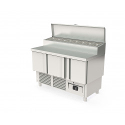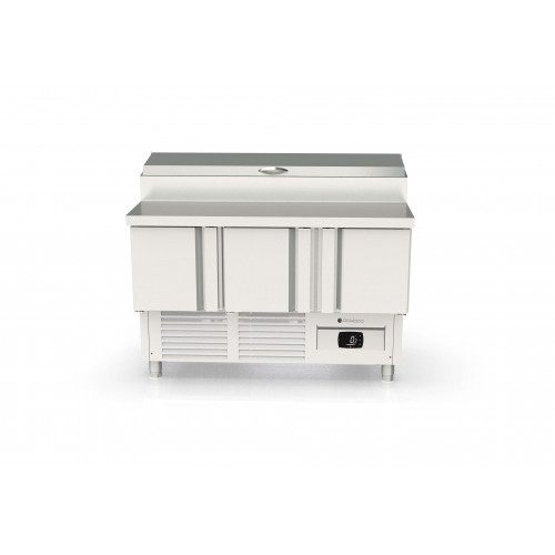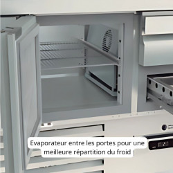 Meuble 700 positif - Série saladette GASTRO - Série Top - Température 0°/+8°C - 3 portes pleines - Capacité 320L - Dessus inox + couvercle pour recevoir en plan incliné des bacs 1/4 prof. 150 - Capacité 8 bacs GN1/4 - Extérieur et intérieur en inox AISI-304 18/10 (sauf partie arrière) - Thermostat électronique avec afficheur digital, spécial économie d'énergie - Alarme haute et basse température sur contrôleur digital - Compresseur hermétique ventilé sur glissières - Evaporateur ventilé traité anti-corrosion - Evaporation automatique des eaux de dégivrage - Porte emboutie et réversible - Charnières inox - Joint déclispable - Pieds inox réglables (90 à 135mm) - Bacs non fournis - Livré avec 1 clayette rilsan GN1/1 + 1 jeu de glissières par porte - Ambiance 32°C