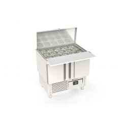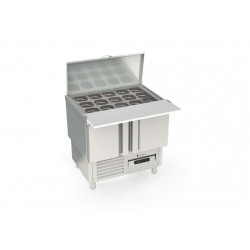 Meuble 700 positif - Série saladette GASTRO - Série Top - Température 0°/+8°C - 2 portes pleines - Capacité 200L - Plaque de travail (sur rails) en polyéthylène blanc + dessus inox rabattable au dessus des bacs - Capacité 12 bacs GN1/6 prof. 200 et 3 prof. 100 - Extérieur et intérieur en inox AISI-304 18/10 (sauf partie arrière) - Thermostat électronique avec afficheur digital, spécial économie d'énergie - Compresseur hermétique ventilé sur glissières - Evaporateur entre portes ventilé et traité anti-corrosion - Evaporation automatique des eaux de dégivrage - Alarme haute et basse température sur contrôleur digital - Porte emboutie et réversible - Charnières inox - Joint déclispable - Pieds inox réglables (90 à 135mm) - Bacs non fournis - Livré avec 1 clayette rilsan GN1/1 + 1 jeu de glissières par porte et 2 barrettes de séparation pour bacs - Ambiance 32°C