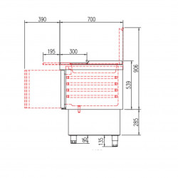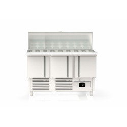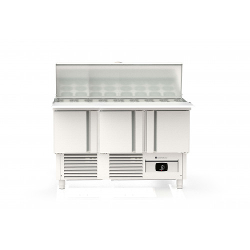 Meuble 700 positif - Série saladette GASTRO - Série Top - Température 0°/+8°C - 3 portes pleines - Capacité 320L - Plaque de travail (sur rails) en polyéthylène blanc + dessus inox rabattable au dessus des bacs - Capacité 18 bacs GN1/6 prof. 200 et 6 bacs GN1/9 prof. 100 - Extérieur et intérieur en inox AISI-304 18/10 (sauf partie arrière) - Thermostat électronique avec afficheur digital, spécial économie d'énergie - Compresseur hermétique ventilé sur glissières - Evaporateur entre portes ventilé et traité anti-corrosion - Evaporation automatique des eaux de dégivrage - Alarme haute et basse température sur contrôleur digital - Porte emboutie et réversible - Charnières inox - Joint déclispable - Pieds inox réglables (90 à 135mm) - Bacs non fournis - Livré avec 1 clayette rilsan GN1/1 + 1 jeu de glissières par porte et 3 barrettes de séparation pour bacs - Ambiance 32°C