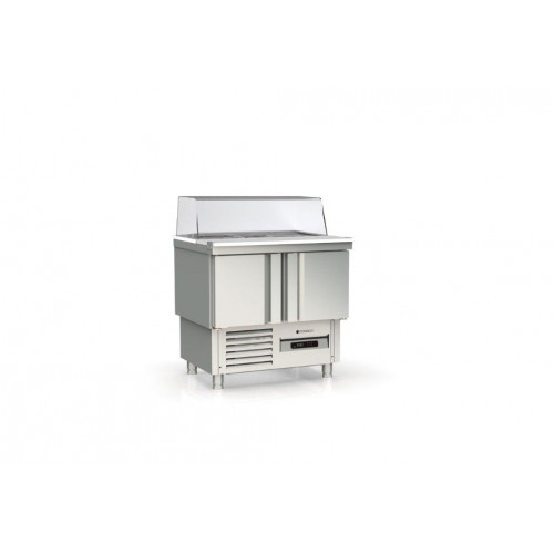 Meuble 700 positif - Série saladette GASTRO - Série Top - Température 0°/+8°C - 2 portes pleines - Capacité 200L - Plaque de travail (sur rails) en polyéthylène + pare haleine en verre de 250mm - Capacité 12 bacs GN1/6 prof. 200 et 3 prof. 100 - Extérieur et intérieur en inox AISI-304 18/10 (sauf partie arrière) - Thermostat électronique avec afficheur digital, spécial économie d'énergie - Compresseur hermétique ventilé sur glissières - Evaporateur entre portes ventilé et traité anti-corrosion - Evaporation automatique des eaux de dégivrage - Alarme haute et basse température sur contrôleur digital - Porte emboutie et réversible - Charnières inox - Joint déclispable - Pieds inox réglables (90 à 135mm) - Bacs non fournis - Livré avec 1 clayette rilsan GN1/1 + 1 jeu de glissières par porte et 2 barrettes de séparation pour bacs - Ambiance 32°C