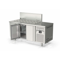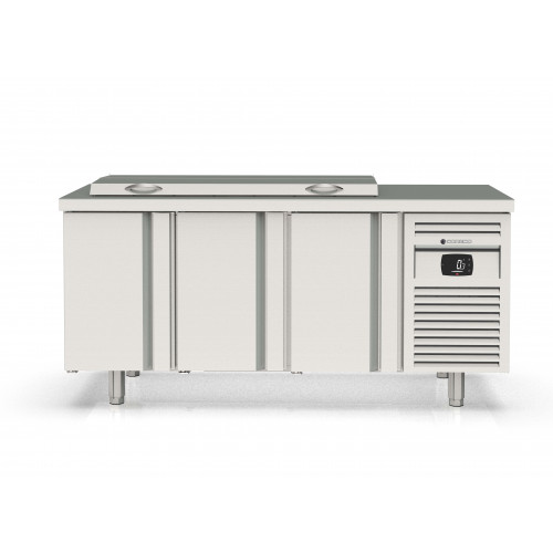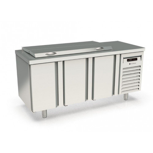 Meuble 700 positif - Série préparation GASTRO - Série Top - Température 0°/+8°C - 3 portes pleines - Capacité 450L - Dessus inox avec couvercle pour 21 bacs GN1/6 prof. 150 (bacs non fournis) - Extérieur et intérieur en inox AISI-304 18/10 (sauf partie arrière) - Thermostat électronique avec afficheur digital, spécial économie d'énergie - Compresseur hermétique ventilé sur glissières - Evaporateur entre portes ventilé traité anti-corrosion - Evaporation automatique des eaux de dégivrage - Alarme haute et basse température sur contrôleur digital - Porte emboutie et réversible - Charnières inox - Joint déclispable - Pieds inox réglables de 135 à 210mm - Livré avec 1 clayette rilsan GN1/1 + 1 jeux de glissières par porte + 2 barrettes de séparation - Ambiance 32°C