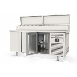 Meuble positif - Série préparation 700 - Série Top - Température 0°/+8°C - 3 portes pleines - Capacité 450L - Meuble pour 10 bacs GN1/4 (non fournis) 7 prof. 150 et 3 prof. 65 - Couvercle rabattable - Extérieur et intérieur en inox AISI-304 18/10 (sauf partie arrière en galva) - Thermostat électronique avec afficheur digital, spécial économie d'énergie - Alarme haute et basse température sur contrôleur digital - Evaporateur ventilé traité anti-corrosion - Compresseur hermétique ventilé sur glissières - Evaporation automatique des eaux de dégivrage - Porte emboutie et réversible - Charnière inox - Joint déclispable - Pieds inox réglables en hauteur de 135 à 210 mm - Livré avec 1 clayette rilsan GN1/1 et 1 jeu de glissière par porte réglable en hauteur - Ambiance 32°C