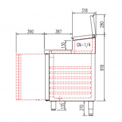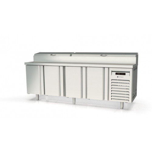 Meuble positif - Série préparation 700 - Série Top - Température 0°/+8°C - 4 portes pleines - Capacité 635L - Meuble pour 13 bacs GN1/4 (non fournis) 10 prof. 150 et 3 prof. 65 - Couvercle rabattable - Extérieur et intérieur en inox AISI-304 18/10 (sauf partie arrière en galva) - Thermostat électronique avec afficheur digital, spécial économie d'énergie - Alarme haute et basse température sur contrôleur digital - Evaporateur ventilé traité anti-corrosion - Compresseur hermétique ventilé sur glissières - Evaporation automatique des eaux de dégivrage - Porte emboutie et réversible - Charnière inox - Joint déclispable - Pieds inox réglables en hauteur de 135 à 210 mm - Livré avec 1 clayette rilsan GN1/1 et 1 jeu de glissière par porte réglable en hauteur - Ambiance 32°C