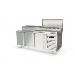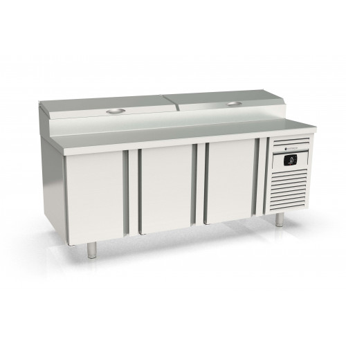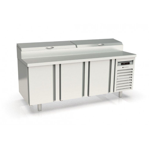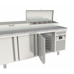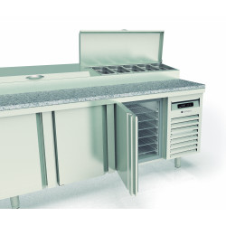 Meuble positif - Série préparation 800 - Série Top - Température 0°/+8°C - 3 portes pleines - Capacité 595L - Meuble pour 10 bacs GN1/3 (non fournis) 7 prof. 150 et 3 prof. 65 - Couvercle rabattable - Extérieur et intérieur en inox AISI-304 18/10 (sauf partie arrière en galva) - Thermostat électronique avec afficheur digital, spécial économie d'énergie - Alarme haute et basse température sur contrôleur digital - Evaporateur ventilé traité anti-corrosion - Compresseur hermétique ventilé sur glissières - Evaporation automatique des eaux de dégivrage - Porte emboutie et réversible - Charnière inox - Joint déclispable - Pieds inox réglables en hauteur de 135 à 210 mm - Livré avec 1 clayette rilsan 600x400 et 1 jeu de glissière par porte réglable en hauteur - Ambiance 32°C
