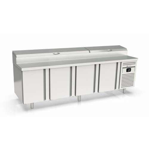 Meuble positif - Série préparation 800 - Série Top - Température 0°/+8°C - 4 portes pleines - Capacité 815L - Meuble pour 12 bacs GN1/3 (non fournis) 9 prof. 150 et 3 prof. 65 - Couvercle rabattable - Extérieur et intérieur en inox AISI-304 18/10 (sauf partie arrière en galva) - Thermostat électronique avec afficheur digital, spécial économie d'énergie - Alarme haute et basse température sur contrôleur digital - Evaporateur ventilé traité anti-corrosion - Compresseur hermétique ventilé sur glissières - Evaporation automatique des eaux de dégivrage - Porte emboutie et réversible - Charnière inox - Joint déclispable - Pieds inox réglables en hauteur de 135 à 210 mm - Livré avec 1 clayette rilsan 600x400 et 1 jeu de glissière par porte réglable en hauteur - Ambiance 32°C