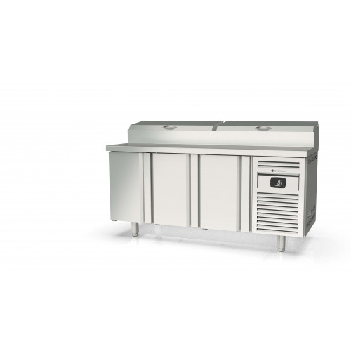Meuble positif - Série préparation 700 - Série Top - Température 0°/+8°C - 3 portes pleines - Capacité 450L - Meuble pour 8 bacs GN1/6 (non fournis) 5 prof. 150 et 3 prof. 65 - Couvercle rabattable - Extérieur et intérieur en inox AISI-304 18/10 (sauf partie arrière en galva) - Thermostat électronique avec afficheur digital, spécial économie d'énergie - Alarme haute et basse température sur contrôleur digital - Evaporateur ventilé traité anti-corrosion - Compresseur hermétique ventilé sur glissières - Evaporation automatique des eaux de dégivrage - Porte emboutie et réversible - Charnière inox - Joint déclispable - Pieds inox réglables en hauteur de 135 à 210 mm - Livré avec 1 clayette rilsan GN1/1 et 1 jeu de glissière par porte réglable en hauteur - Ambiance 32°C