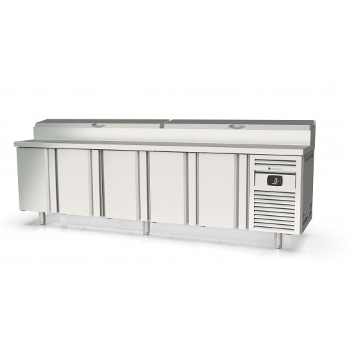 Meuble positif - Série préparation 700 - Série Top - Température 0°/+8°C - 5 portes pleines - Capacité 1050L - Meuble pour 14 bacs GN1/6 (non fournis) 11 prof. 150 et 3 prof. 65 - Couvercle rabattable - Extérieur et intérieur en inox AISI-304 18/10 (sauf partie arrière en galva) - Thermostat électronique avec afficheur digital, spécial économie d'énergie - Alarme haute et basse température sur contrôleur digital - Evaporateur ventilé traité anti-corrosion - Compresseur hermétique ventilé sur glissières - Evaporation automatique des eaux de dégivrage - Porte emboutie et réversible - Charnière inox - Joint déclispable - Pieds inox réglables en hauteur de 135 à 210 mm - Livré avec 1 clayette rilsan GN1/1 et 1 jeu de glissière par porte réglable en hauteur - Ambiance 32°C