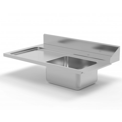 Plan de travail mural de prélavage avec bac à gauche - AISI-304 18/10 satiné - Dosseret entièrement soudé de 135 mm et bord avant de 50 mm, entièrement soudé - Fixation universelle - Cuve intégrée de 500x400x250 mm avec insonorisation, tube surverse et bonde - Montage simple et rapide au moyen de vis (incluses)