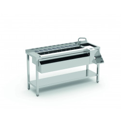Table cocktail - 1600 MM - Sans étagère - Evier à droite - En acier inoxydable AISI 304 18/10, finition satinée - Structure en tube d’acier inoxydable 40x40mm soudée au plan de travail - Plan de travail avec dosseret de 40 mm - Évier 275x250x165mm avec vidange intégrée - Robinet mélangeur inclus - Rince-verres à pression, avec grille amovible - 1 poubelle de découpe - Intègre 2 planches de découpe en polyéthylène, extractibles pour le nettoyage, 1x (190x260x20mm) et 1x (730x60x20mm) - Cuve thermiquement isolée de 940x405x300mm avec polyuréthane injecté écologique et vidange incorporée - Fond perforé dans toute la cuve ainsi que 2 séparateurs mobiles - Capacité de la cuve isolée : 2 zones pour la glace, 2 zones pour les bouteilles et 1 zone pour les bacs 10 GN 1/9-100 (plateaux non inclus dans le prix, voir kit optionnel KC-160) - Support frontal (porte-bouteilles avant) 785 mm avec capacité pour 14/16 bouteilles, facilement démontable - 1 support pour blender, avec passe-câbles d’alimentation, facilement démontable