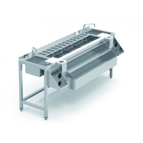 Table cocktail - 2000 MM - Sans étagère - En acier inoxydable AISI 304 18/10, finition satinée - Structure en tube d’acier inoxydable 40x40mm soudée au plan de travail - Plan de travail avec dosseret de 40 mm - 2 éviers 275x250x165mm avec vidange intégrée - 2 robinets mélangeur inclus - 2 rince-verres à pression, avec grille amovible - 2 poubelles de découpe - Intègre 3 planches de découpe en polyéthylène, extractibles pour le nettoyage, 2x (190x260x20mm) et 1x (1265x60x20mm) - Cuve thermiquement isolée de 1265x400x300mm avec polyuréthane injecté écologique et vidange incorporée - Fond perforé dans toute la cuve ainsi que 4 séparateurs mobiles - Capacité de la cuve isolée : 3 zones pour la glace, 2 zones pour les bouteilles et 1 zone pour les bacs 12 GN 1/9-100 (plateaux non inclus dans le prix, voir kit optionnel KC-200) - Support frontal (porte-bouteilles avant) 1265 avec capacité pour 13/15 bouteilles, facilement démontable - 2 supports pour blender, avec passe-câbles d’alimentation, facilement démontable