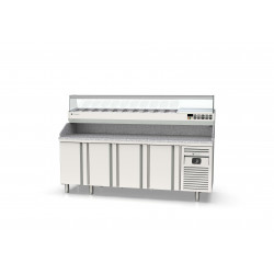 Meuble positif - Série pizza 600 - Série Top - Température -2°/+8°C - 4 portes pleines - Capacité 560L - Dessus granit avec dosseret et joues de 180 mm -Extérieur et intérieur en inox AISI-304 18/10 (sauf partie arrière en galva) - Thermostat électronique avec afficheur digital, spécial économie d'énergie - Alarme haute et basse température sur contrôleur digital - Evaporateur ventilé traité anti-corrosion - Compresseur hermétique ventilé sur glissières - Evaporation automatique des eaux de dégivrage - Porte emboutie et réversible - Charnière inox - Joint déclispable - Pieds inox réglables en hauteur de 135 à 210 mm - Livré avec 1 clayette rilsan par porte réglable en hauteur sur support inox - Ambiance 32°C