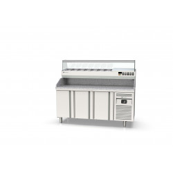 Meuble positif - Série pizza 700 - Série Top - Température -2°/+8°C - 3 portes pleines - Capacité 450L - Dessus granit avec dosseret et joues de 180 mm - Extérieur et intérieur en inox AISI-304 18/10 (sauf partie arrière en galva) - Thermostat électronique avec afficheur digital, spécial économie d'énergie - Alarme haute et basse température sur contrôleur digital - Evaporateur ventilé traité anti-corrosion - Compresseur hermétique ventilé sur glissières - Evaporation automatique des eaux de dégivrage - Porte emboutie et réversible - Charnière inox - Joint déclispable - Pieds inox réglables en hauteur de 135 à 210 mm - Livré avec 1 clayette inox GN1/1 et 1 jeu de glissière par porte réglable en hauteur - Ambiance 32°C