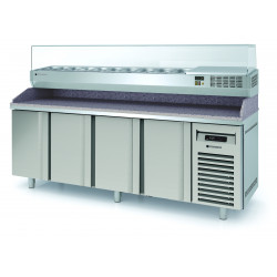 Meuble positif - Série pizza 700 - Série Top - Température -2°/+8°C - 4 portes pleines - Capacité 635L - Dessus granit avec dosseret et joues de 180 mm - Extérieur et intérieur en inox AISI-304 18/10 (sauf partie arrière en galva) - Thermostat électronique avec afficheur digital, spécial économie d'énergie - Alarme haute et basse température sur contrôleur digital - Evaporateur ventilé traité anti-corrosion - Compresseur hermétique ventilé sur glissières - Evaporation automatique des eaux de dégivrage - Porte emboutie et réversible - Charnière inox - Joint déclispable - Pieds inox réglables en hauteur de 135 à 210 mm - Livré avec 1 clayette inox GN1/1 et 1 jeu de glissière par porte réglable en hauteur - Ambiance 32°C