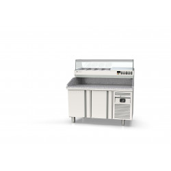 Meuble positif - Série pizza 800 - Série Top - Température -2°/+8°C - 2 portes pleines - Capacité 375L - Dessus granit avec dosseret et joues de 180 mm - Extérieur et intérieur en inox AISI-304 18/10 (sauf partie arrière en galva) - Thermostat électronique avec afficheur digital, spécial économie d'énergie - Alarme haute et basse température sur contrôleur digital - Evaporateur ventilé traité anti-corrosion - Compresseur hermétique ventilé sur glissières - Evaporation automatique des eaux de dégivrage - Porte emboutie et réversible - Charnière inox - Joint déclispable - Pieds inox réglables en hauteur de 135 à 210 mm - Livré avec 5 jeux de glissière inox par porte réglable en hauteur, la porte extrême est livrée avec 3 jeux de glissières et 3 casiers plastiques 600x400x70 - Ambiance 32°C