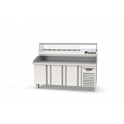 Meuble positif - Série pizza 800 - Série Top - Température -2°/+8°C - 3 portes pleines - Capacité 595L - Dessus granit avec dosseret et joues de 180 mm - Extérieur et intérieur en inox AISI-304 18/10 (sauf partie arrière en galva) - Thermostat électronique avec afficheur digital, spécial économie d'énergie - Alarme haute et basse température sur contrôleur digital - Evaporateur ventilé traité anti-corrosion - Compresseur hermétique ventilé sur glissières - Evaporation automatique des eaux de dégivrage - Porte emboutie et réversible - Charnière inox - Joint déclispable - Pieds inox réglables en hauteur de 135 à 210 mm - Livré avec 5 jeux de glissière inox par porte réglable en hauteur, la porte extrême est livrée avec 3 jeux de glissières et 3 casiers plastiques 600x400x70 - Ambiance 32°C