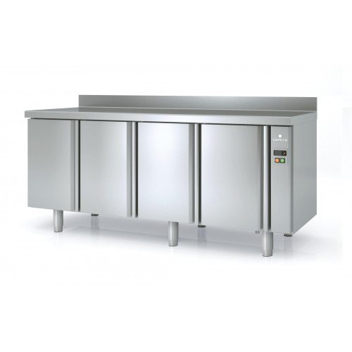 Meuble 700 positif - Série GASTRO groupe à distance - Température -2°/+8°C - 4 portes pleines - Capacité 635L - Extérieur et intérieur en inox AISI-304 18/10 (sauf partie arrière en galva) - Dosseret de 100mm (sans dosseret sur demande) - Livré sans groupe, sans capillaire ni détendeur - Bandeau de commande latéral et frontal démontable - Thermostat électronique avec afficheur digital, spécial économie d'énergie - Pas d'évaporation des eaux de condensat - Porte inox emboutie et réversible - Charnières inox - Joint déclipsable - Pieds inox réglables (hauteur meuble possible 900) - Livré avec 1 clayette inox GN1/1 + 1 jeu de glissières par porte - Ambiance 40°C - Alarme haute et basse température sur contrôleur digital