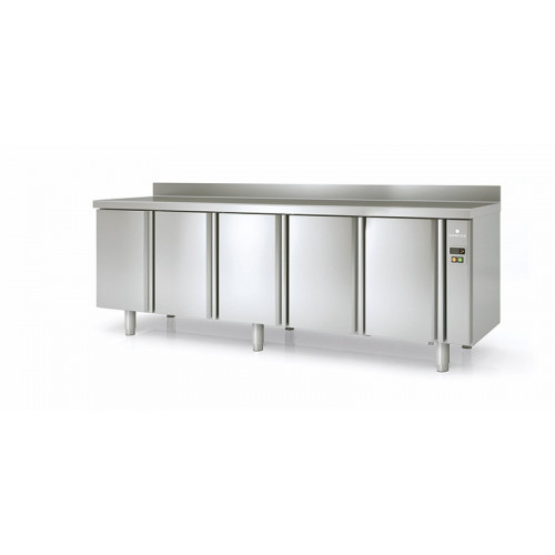 Meuble 700 positif - Série GASTRO groupe à distance - Température -2°/+8°C - 5 portes pleines - Capacité 820L - Extérieur et intérieur en inox AISI-304 18/10 (sauf partie arrière en galva) - Dosseret de 100mm (sans dosseret sur demande) - Livré sans groupe, sans capillaire ni détendeur - Bandeau de commande latéral et frontal démontable - Thermostat électronique avec afficheur digital, spécial économie d'énergie - Pas d'évaporation des eaux de condensat - Porte inox emboutie et réversible - Charnières inox - Joint déclipsable - Pieds inox réglables (hauteur meuble possible 900) - Livré avec 1 clayette inox GN1/1 + 1 jeu de glissières par porte - Ambiance 40°C - Alarme haute et basse température sur contrôleur digital