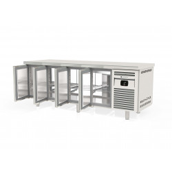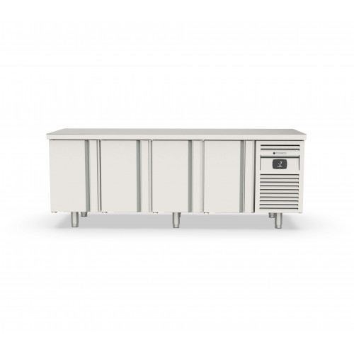 Meuble 700 positif - Série GASTRO traversant - Température -2°/+8°C - 4 + 4 portes pleines = 8 portes - Capacité 635L - Extérieur et intérieur en inox AISI-304 18/10 (sauf partie arrière en galva) - Thermostat électronique avec afficheur digital, spécial économie d'énergie - Compresseur hermétique ventilé sur glissières - Evaporateur ventilé traité anti-corrosion - Evaporation automatique des eaux de dégivrage - Porte emboutie et réversible - Charnières inox - Joint déclipsable - Pieds inox réglables (hauteur meuble possible 900) - Livré avec 1 clayette inox GN1/1 par porte + 1 jeu de glissières par porte - Ambiance 40°C - Alarme haute et basse température sur contrôleur digital