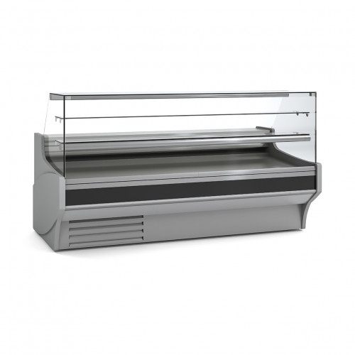 Vitrine pâtissière - Profondeur 940 - Extérieur et intérieur acier plastifié - Plan de travail et surface d'expo inox AISI-304 - Cotés ABS thermoformé épaisseur 30 - Isolation en polyuréthane - Vitre droite double sécurit rabattable - Thermostat électronique réglable avec affichage digital - Dégivrage automatique - Evaporation automatique des eaux de dégivrage - Stockage réfrigéré avec portes, entrée 440x270mm - Lumière LED intérieure sous1 étagère, en partie haute et en façade - Profilés en aluminium anodisé - Protection frontale anti-choc - 2 étagères en verre non réfrigérées - Froid ventilé - Classe climatique 4 (30°C 55%), régime M1 (-1/+5°C)