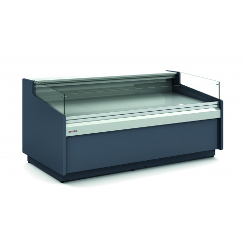 Vitrine libre service - Profondeur 1100 - Extérieur et intérieur en acier plastifié - Surface d’exposition et plan de travail en inox AISI-304 - Côtes en ABS thermoformé, épaisseur 30 mm - Profilés en aluminium anodise - Pare-chocs en partie frontale -