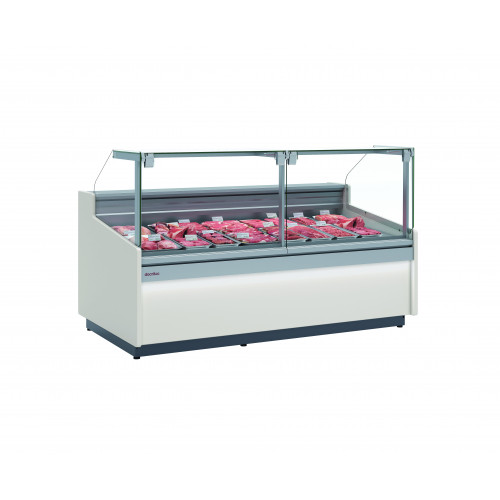 Vitrine avec vitre relevable - Profondeur 1100 - Extérieur et intérieur acier plastifié - Plan de travail et surface d'expo inox AISI-304 - Cotés ABS thermoformé épaisseur 30 - Profilés en aluminium anodisé - Isolation en polyuréthane - Vitre double droite sécurit - Thermostat électronique réglable avec affichage digital - Dégivrage automatique - Evaporation automatique des eaux de dégivrage - Stockage réfrigéré avec portes, entrée 440x270mm - Lumière LED intérieure en partie haute - Protection frontale anti-choc - Froid ventilé - Condenseur ventilé - Classe climatique 3 (25°C 60%), température de fonctionnement (0/+6°C) - Volume réserve (m3) : 0,79 - Surface vitrée (m2) : 1,58 - 3 portes