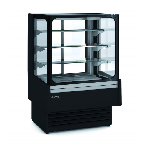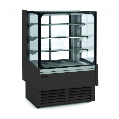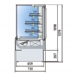 Vitrine service arrière 3 étagères - Extérieur en acier plastifié - Intérieur en inox AISI-304 18/10 - Fond plat - Cotés ABS thermoformé - Isolation en polyuréthane - Profils en aluminium anodisé - 3 étagères fixe en verre - 2 portes arrières coulissantes - Vitre droite en double vitrage sécurit rabattable - Lumière LED en partie haute et sous chaque étagère - Froid ventilé - Condenseur ventilé - Evaporateur ventilé - Dégivrage automatique avec évaporation automatique - Thermostat électronique à affichage digital - Décoration façade et côtés en standard - Classe climatique 3 (25°C 60%)