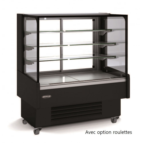 Vitrine libre-service 3 étagères - Extérieur en acier plastifié laqué ou inox - Intérieur en acier inoxydable AISI-304 18/10 - Fond plat - Cotés ABS thermoformé - Isolation en polyuréthane - Profilés en aluminium anodisé - 3 étagères fixes en verre - Pas de vitre à l'avant (libre service) - 2 portes coulissantes à l'arrière - Rideau de nuit en standard - Lumière LED en partie haute et sous chaque étagère - Froid ventilé - Condenseur et évaporateur ventilés - Dégivrage automatique avec évaporation automatique - Thermostat électronique à affichage digital - Décoration façade et côtés en standard - Classe climatique 3 (25°C 60%) - Surface vitrée (m2) : 0,82