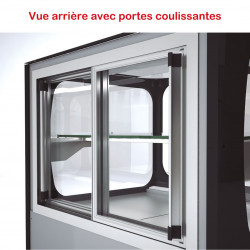 Vitrine haute service arrière réfrigérée - Extérieur en acier plastifié - Intérieur en inox AISI-304 18/10 - Cotés avec double vitrage - Isolation en polyuréthane - Profils en aluminium anodisé - 3 étagères en verre réglables en hauteur et inclinables - 2 portes arrières coulissantes - Vitre droite en double vitrage sécurit - Lumière LED en partie haute et sous chaque étagère - Froid ventilé - Condenseur ventilé - Evaporateur ventilé - Dégivrage automatique avec évaporation automatique - Thermostat électronique à affichage digital - Décoration façade et côtés en standard - Classe climatique 3 (25°C 60%)