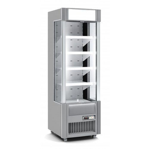 Vitrine promotionnelle - Température positive (-1°/+5°C) - Capacité 332l - Ouverte sur l'avant - Extérieur en acier galvanisé gris - Intérieur en acier galvanisé blanc - Contrôle digital de la température - Evaporateur et condenseur ventilés - Evaporation automatique des eaux de dégivrage - Isolation en polyuréthane - Eclairage intérieur LED horizontal et vertical - Rideau de nuit - Dotation : 4+1 étagères réglables en hauteur et inclinables avec porte-étiquettes