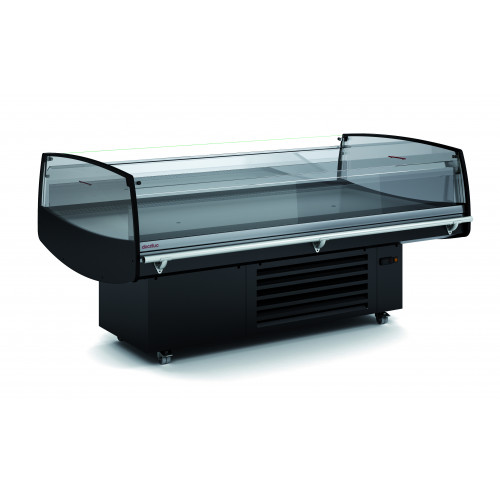 Vitrine/Ilot libre-service – Extérieur en acier plastifié - Intérieur en tôle d'acier finition époxy blanc, noir ou inox – Châssis en acier époxy -Double virage sécurisé – Isolation en polyuréthane injecté, densité 40kgs/m3, aucun effet ODP, GWP – Condensation ventilée – Evaporation automatique des eaux de dégivrage – Contrôle électronique de la température – Plan d’exposition inclinable – Température -1°/+5° (classe 3 régime M1) - Gaz R290