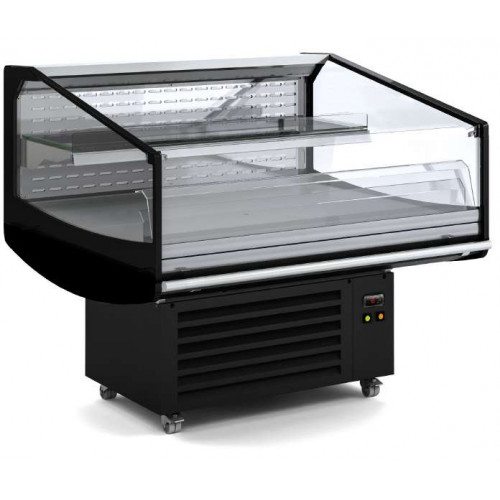 Vitrine/Ilot libre-service – Profondeur 1250 – Extérieur en acier plastifié - Intérieur en tôle d'acier finition époxy blanc, noir ou inox – Châssis en acier époxy -Double virage sécurisé – Isolation en polyuréthane injecté, densité 40kgs/m3, aucun effet ODP, GWP – Condensation ventilée – Evaporation automatique des eaux de dégivrage – Contrôle électronique de la température – Plan d’exposition inclinable – Température -1°/+5° (classe 3 régime M1) – Surface vitrée(m2) : 1.22 – Gaz R290