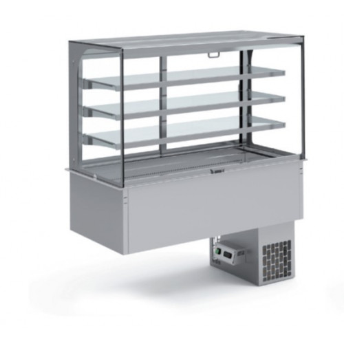 Vitrine murale droite de distribution avec cuve froide à encastrer - Froid ventilé - Parie arrière vitrée coulissante (double vitrage) - 3 niveaux d'exposition en verre securit - Fermeture par rideau de nuit - Construction inox AISI-304 18/10 satiné - Evaporateur ventilé - Température de la cuve : +4°/+12°C - Vidange intégrée - Panneau de commande amovible avec thermostat digital et interrupteur lumineux - Dimensions encastrement : 1404 x 695 x 760 mm - Capacité cuve : 4 GN1/1 prof. 150