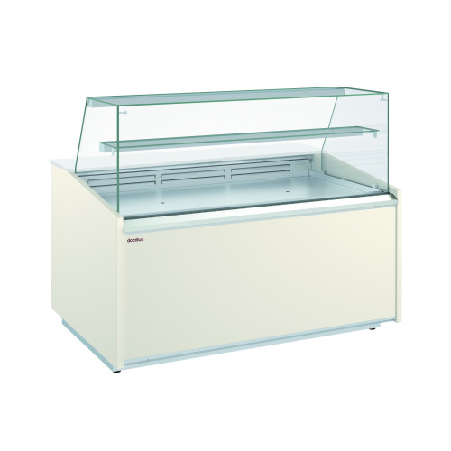 Vitrine fond plat étagère (non réfrigérée) - Visibilité maximum - Surface d'expo avec fond plat surélevé en inox AISI-304 - Plan de travail en aggloméré de quartz, couleur blanc (RAL 9010) avec Lumière LED LED au dessus de la surface d'exposition - Côtés (épaisseur 30mm) et façade en bois laqué métallisé ou imitation bois - Isolation en polyuréthane - Vitre sécurit fixe - Stockage réfrigéré avec portes, entrée 440x270mm - Froid ventilé - Classe climatique 3 (25°C 60%), température de fonctionnement (0/+6°C)
