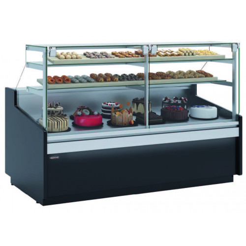 Vitrine - Profondeur 1100 - 2 étagères en verre non réfrigérées - Extérieur et intérieur acier plastifié - Plan de travail et surface d'expo inox AISI-304 - Cotés ABS thermoformé épaisseur 30 - Isolation en polyuréthane - Vitre droite double sécurit rabattable - Thermostat électronique réglable avec affichage digital - Dégivrage automatique - Evaporation automatique des eaux de dégivrage - Stockage réfrigéré avec portes, entrée 440x270mm - Lumière LED intérieure LED en partie haute et sous étagère - Profilés en aluminium anodisé - Protection frontale anti-choc - Froid ventilé - Classe climatique 4 (30°C 55%), régime M1 (-1/+5°C)