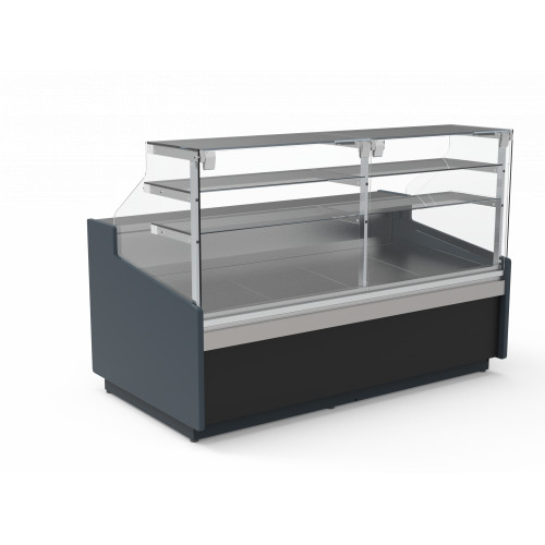 Vitrine - Profondeur 1100 - 2 étagères en verre non réfrigérées - Extérieur et intérieur acier plastifié - Plan de travail et surface d'expo inox AISI-304 - Cotés ABS thermoformé épaisseur 30 - Isolation en polyuréthane - Vitre droite double sécurit rabattable - Thermostat électronique réglable avec affichage digital - Dégivrage automatique - Evaporation automatique des eaux de dégivrage - Stockage réfrigéré avec portes, entrée 440x270mm - Lumière LED intérieure LED en partie haute et sous étagère - Profilés en aluminium anodisé - Protection frontale anti-choc - Froid ventilé - Classe climatique 3 (25°C 60%), température de fonctionnement (0/+6°C)