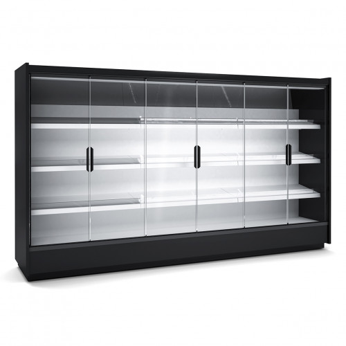 Vitrine murale supermarché gamme CLOVER - Hauteur 2,21m - Profondeur 1091 mm - Avec portes vitrées - Vitrine verticale pour le raccordement à une unité de condensation ou à un groupe frigorifique avec une capacité et une visibilité optimisées - Intérieur standard en époxy RAL 9003 (blanc) - Grande possibilité de personnalisation. Standard : base inférieure en RAL 9005, bande supérieure et inférieure en tôle dans un choix de couleurs disponibles - Évaporateur HFC ventilé, peint en EPOXI avec revêtement anticorrosion - Jeu de vanne solénoïde et d’un détenteur thermostatique en R449A /R-448A ou R134a - Etagères réglables en hauteur et inclinables, avec le porte prix de 40 mm inclus - Dégivrage automatique de l’évaporateur - Ventilateurs électromécaniques - Contrôle électronique - Portes battantes avec façade entièrement vitrée avec sérigraphie minimale, ouverture possible jusqu’à 93º et système de blocage en position ouverte manuelle. La fermeture automatique avec une barre de torsion de haute durabilité, assure une économie d’énergie par rapport au modèle sans porte