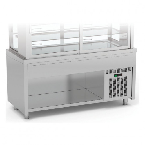 Meuble à boissons - Meuble avec vitrine 3 niveaux - Sans réserve - Construction en inox AISI-304 18/10 satiné - Groupe extractible sur glissières pour faciliter l'entretien et la maintenance - Pieds robustes réglables en hauteur - Vitrine : réfrigération par évaporateur ventilé, dégivrage automatique, évaporation automatique des eaux de dégivrage, réglage de la température par thermostat électronique digital, température : +4°/+12°C, portes coulissantes en verre côté service, portes battantes en méthacrylate , lumière intérieure basse consommation, étagères en verre démontables - Cuve : cuve avec bords arrondis isolée avec du polyuréthane écologique - Capacité : 3 GN1/1 prof. 200-R290