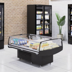 Vitrine/Ilot libre-service – Extérieur en acier plastifié - Intérieur en tôle d'acier finition époxy blanc, noir ou inox – Châssis en acier époxy -Double virage sécurisé – Isolation en polyuréthane injecté, densité 40kgs/m3, aucun effet ODP, GWP – Condensation ventilée – Evaporation automatique des eaux de dégivrage – Contrôle électronique de la température – Plan d’exposition inclinable – Température -1°/+5° (classe 3 régime M1) - Gaz R290