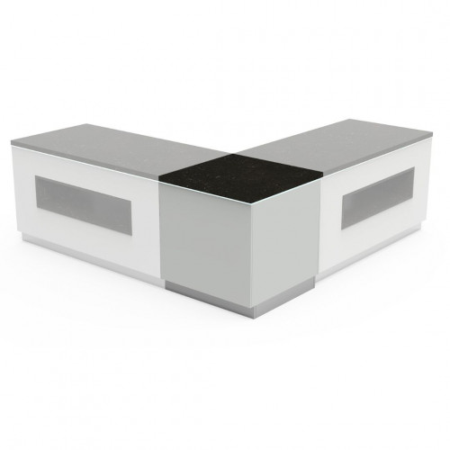 Buffet d'angle intérieur - Disponible pour les buffets de 1100mmx850mm. Plan de travail en pierre de quartz synthétique, fabriqué en une seule pièce. Structure métallique renforcée. Pieds réglables en hauteur pour une mise à niveau correcte. Plinthe en acier ou en inox ou en option en noir. Lampe décorative située entre le plan de travail et les panneaux décoratifs. La structure métallique renforcée est visible car elle ne comporte pas de panneaux décoratifs (pour modèle intérieur)