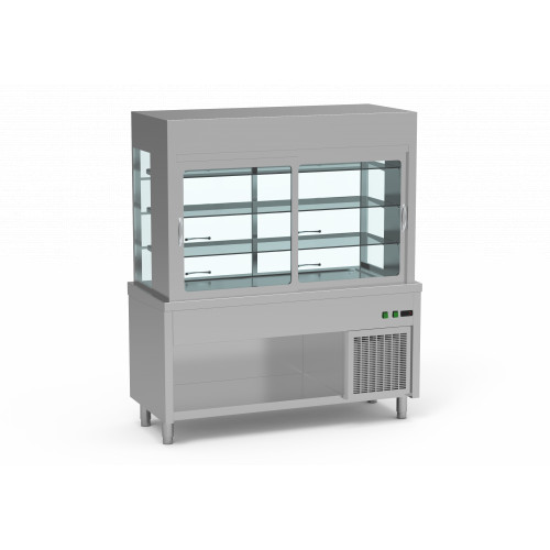 Meuble hors d'œuvres ou desserts - Sans réserve - Construction en inox AISI-304 18/10 satiné - Groupe extractible sur glissières pour faciliter l'entretien et la maintenance - Isolation en polyuréthane - Pieds robustes réglables en hauteur - Vitrine : réfrigération par évaporateur ventilé - Dégivrage et évaporation automatiques - Réglage de la température par thermostat électronique digital - Température : +4°/+12°C - Portes coulissantes en verre côté service - Portes battantes en méthacrylate côté client - Etagères en verre démontables - Lumière intérieure basse consommation - Capacité : 5 GN1/1-R290