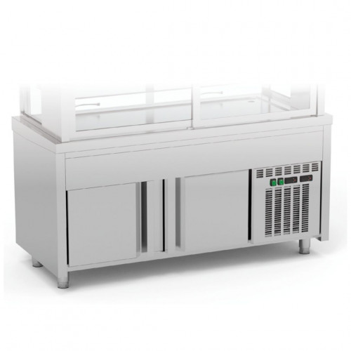 Meuble hors d'œuvres ou desserts - Avec réserve - Dont porte à côté du groupe avec hauteur intérieure réduite - Construction en inox AISI-304 18/10 satiné - Groupe extractible sur glissières pour faciliter l'entretien et la maintenance - Aération en façade - Isolation en polyuréthane - Pieds robustes réglables en hauteur - Vitrine : réfrigération par évaporateur ventilé, évaporation automatique des eaux de dégivrage, réglage de la température par thermostat électronique digital, température : +4°/+12°C, portes coulissantes en verre côté service, portes battantes en méthacrylate côté client, étagères en verre démontables, lumière intérieure basse consommation - Plaque : plaque isolée avec du polyuréthane écologique - Réserve : réserve inférieure avec 2 groupes froids indépendants, évaporateur ventilé et dégivrage automatique, panneau de commande additionnel pour la réserve (+2°/+10°C), livré avec 6 paires de glissières extractibles, livré avec 2 portes de réserves - Capacité : 4 GN1/1-R290