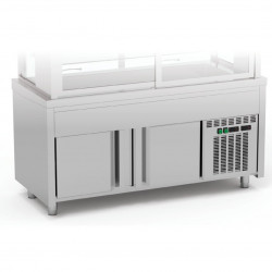 Meuble à boissons - Meuble avec vitrine 3 niveaux - Avec réserve - Dont porte à côté du groupe avec hauteur intérieure réduite - Construction en inox AISI-304 18/10 satiné - Groupe extractible sur glissières pour faciliter l'entretien et la maintenance - Pieds robustes réglables en hauteur - Vitrine : réfrigération par évaporateur ventilé, dégivrage automatique, évaporation automatique des eaux de dégivrage, réglage de la température par thermostat électronique digital, température : +4°/+12°C, portes coulissantes en verre côté service, portes battantes en méthacrylate , lumière intérieure basse consommation, étagères en verre démontables - Cuve : cuve avec bords arrondis isolée avec du polyuréthane écologique - Réserve : réserve inférieure avec 2 groupes froids indépendants, évaporateur ventilé et dégivrage automatique, panneau de commande additionnel pour la réserve (+4°/+12°C), isolation en polyuréthane, livré avec 10 paires de glissières extractibles, livré avec 3 portes de réserves - Capacité : 6 GN1/1 prof. 200-R290
