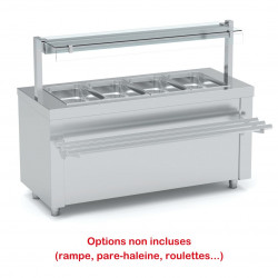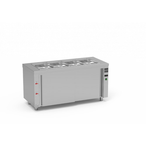 Meuble bain-marie à eau - Avec réserve neutre (2 portes coulissantes) - Construction inox AISI-304 18/10 satiné - Réglage de température par thermostat électronique digital - Chauffage du bain-marie (+50°/+90°C) par résistances silicone sous la cuve - Cuve totalement soudée avec bords arrondis - Dessus avec coins arrondis - Remplissage par robinet + vidange - Pieds réglables en hauteur - Capacité 4 bacs GN1/1 prof 200