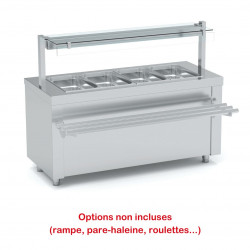 Meuble bain-marie sec - Avec réserve chaude (2 portes coulissantes) - Construction inox AISI-304 18/10 satiné - Chauffage du bain-marie (+50°/+90°C) par résistances blindées, protégées par un double fond perforé - Isolation polyuréthane - Dessus avec coins arrondis - Pieds réglables en hauteur - Réserve : chauffage intérieur par résistances ventilées extractibles avec fusible thermique de sécurité, Panneau de commande additionnel avec thermostat +50°/+90°C, isolation totale par double-parois et fibre de verre sur le meuble et les portes - Capacité 5 bacs GN1/1 prof 150