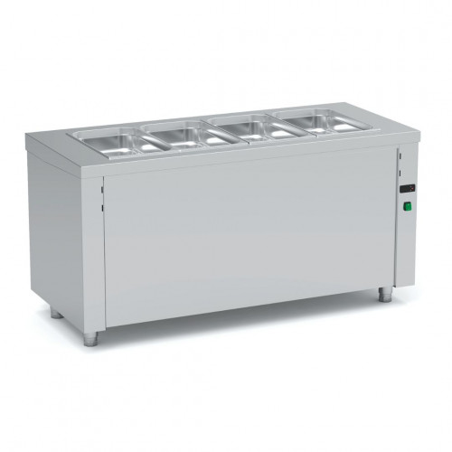 Ilot central avec bain marie à chaleur sèche - Construction inox AISI-304 18/10 satiné - Température +50°/+90°C - Chauffage par résistances blindées, protégées par un double fond perforé - Cuve totalement soudée avec bords arrondis - Isolation en polyuréthane - Dessus avec coins arrondis - Pieds réglables en hauteur - Capacité 4 GN1/1 prof. 200