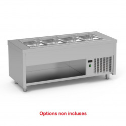 Meuble avec cuve froide - Spécial self pour enfants - Sans réserve - Construction inox AISI-304 18/10 satiné - Réfrigération grâce à un serpentin en cuivre dans le fond et sur les côtés (froid statique) - Cuve totalement soudée - Réglage de température par thermostat électronique digital (pour ambiance 32°) - isolation en polyuréthane - Groupe extractible sur glissières pour faciliter l'entretien et la maintenance - Pieds réglables en hauteur - Dessus avec coins arrondis - Température : 0°/-5°C - Capacité : 3 GN1/1 prof. 200 - Gaz R-290