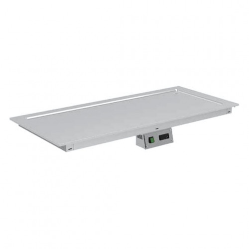 Plaque froide sans groupe à encastrer - Construction inox AISI-304 18/10 finition satinée - Température de la plaque -4°/+4°C - Froid statique grâce à un serpentin en cuivre - Isolation écologique haute densité - Plaque totalement soudée - Panneau de commande amovible avec thermostat digital et interrupteur lumineux - Dimensions encastrement : 1745 x 625 x 50 mm - Capacité : 5 GN1/1